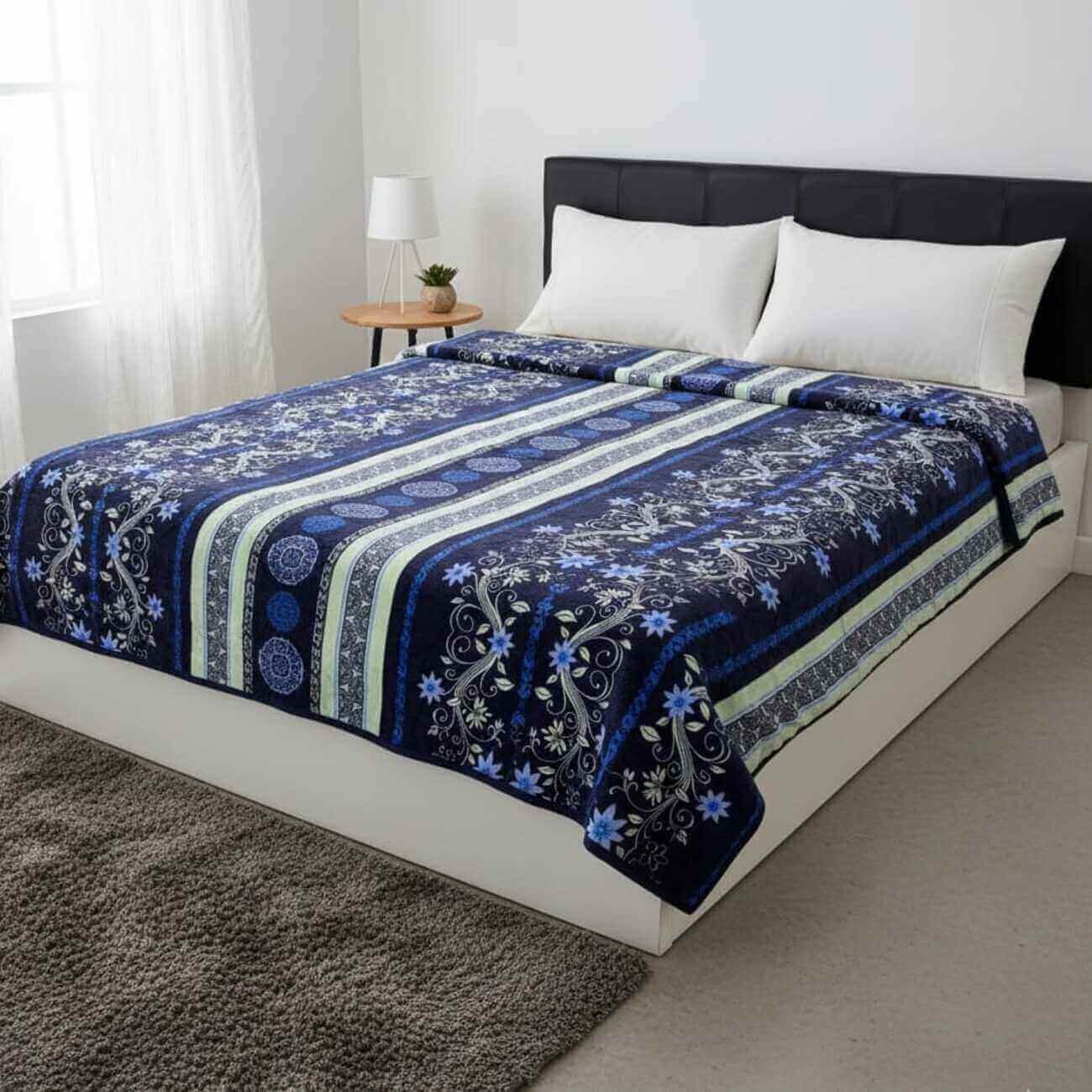 The King Size Printed AC Comforter features a soft, velvet-like fabric with elegant prints, lightweight inner filling for year-round comfort, and a breathable design — perfect for cozy nights in air-conditioned rooms or mild winter weather.