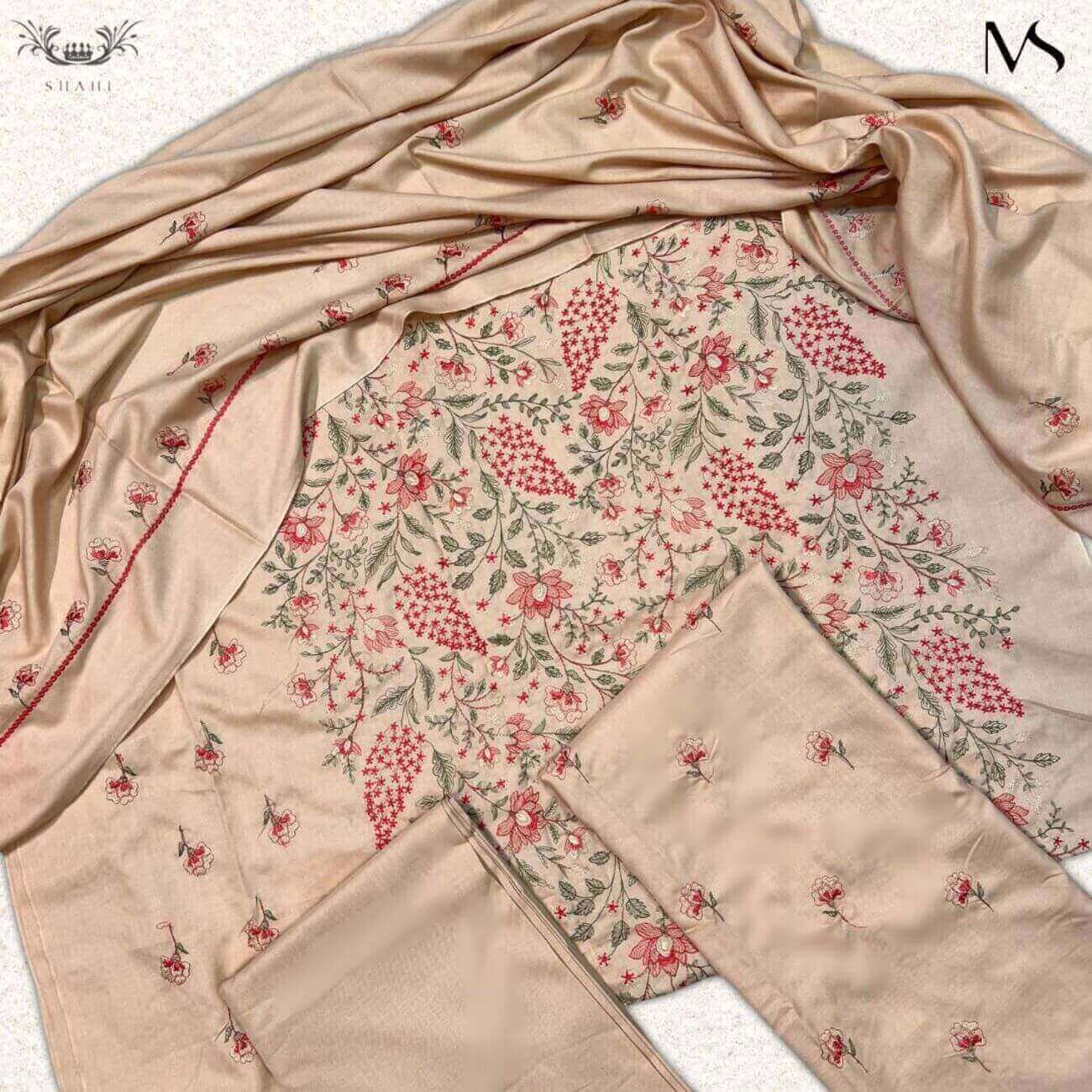 The Dannak Embroidered 3-Piece Suit offers a graceful fusion of traditional embroidery and contemporary style, making it a timeless addition to your seasonal wardrobe. With its embroidered front, subtly detailed back and sleeves, plain trouser, and a beautifully crafted embroidered shawl, this ensemble reflects elegance in every stitch.