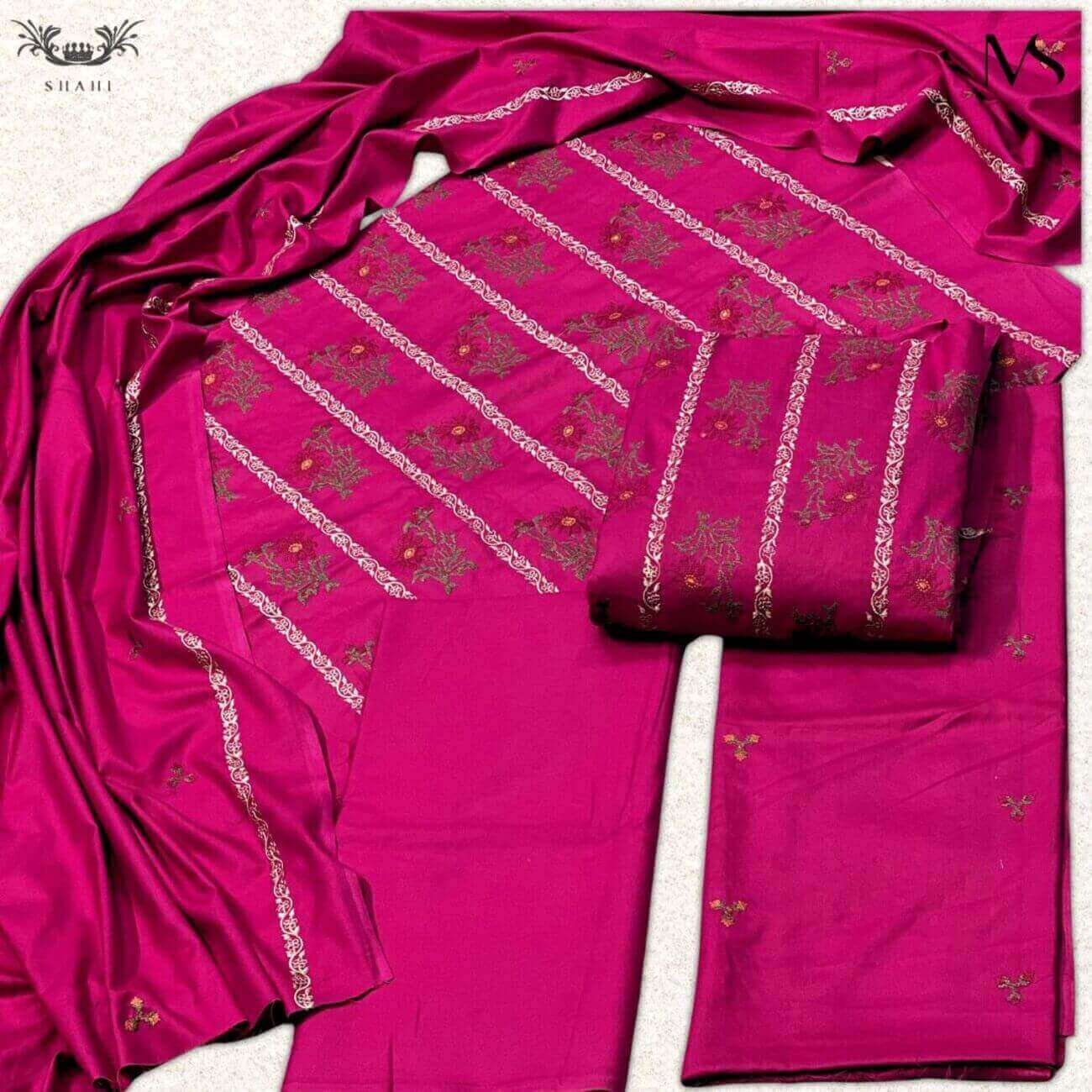 The Dannak Embroidered 3-Piece Suit offers a graceful fusion of traditional embroidery and contemporary style, making it a timeless addition to your seasonal wardrobe. With its embroidered front, subtly detailed back and sleeves, plain trouser, and a beautifully crafted embroidered shawl, this ensemble reflects elegance in every stitch.