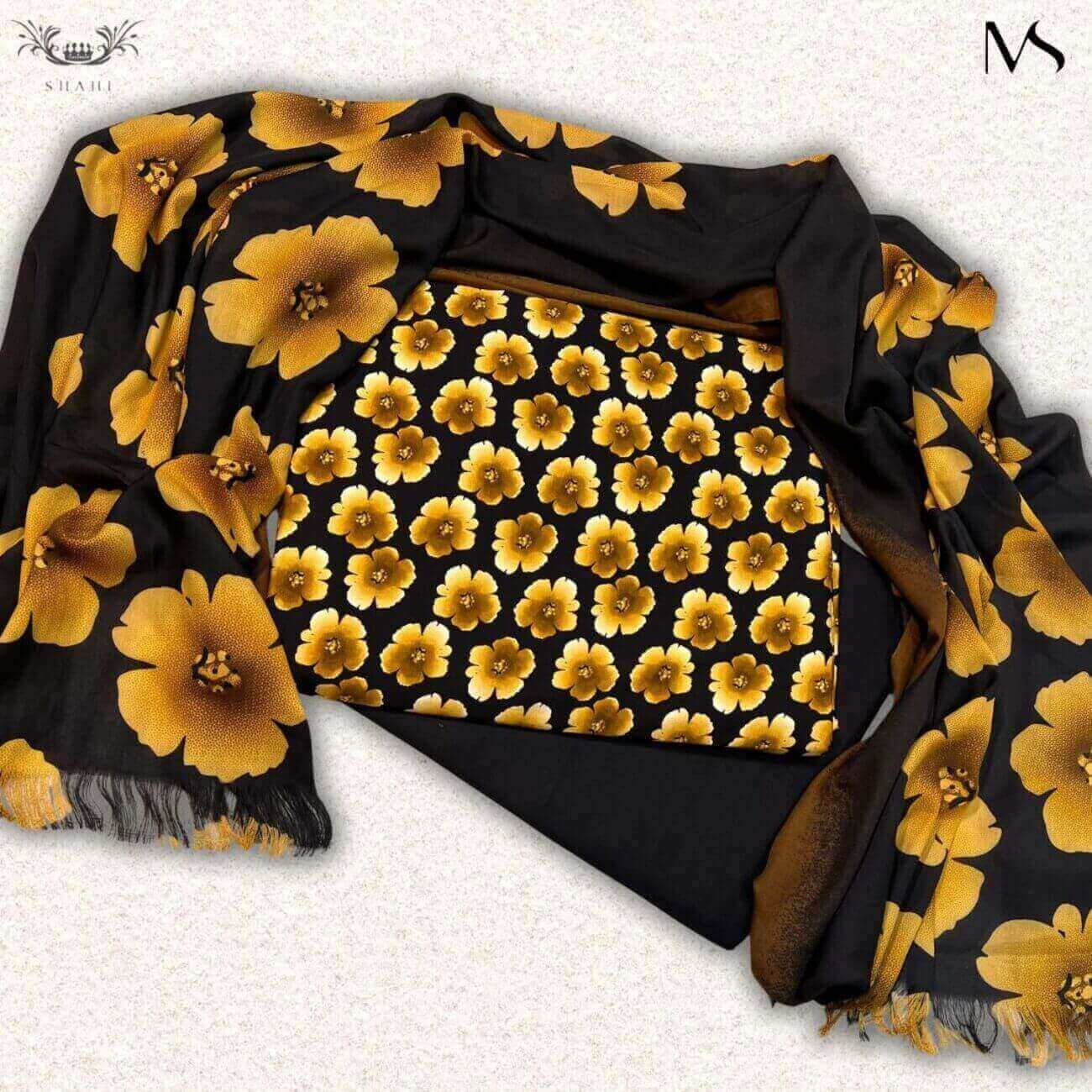 Stay warm and stylish this season with our premium Corduroy 3-piece suit – a perfect blend of comfort, design, and elegance. This unstitched winter ensemble features an all-over printed shirt, a plain trouser, and a matching printed shawl, offering a graceful and complete look for chilly days.